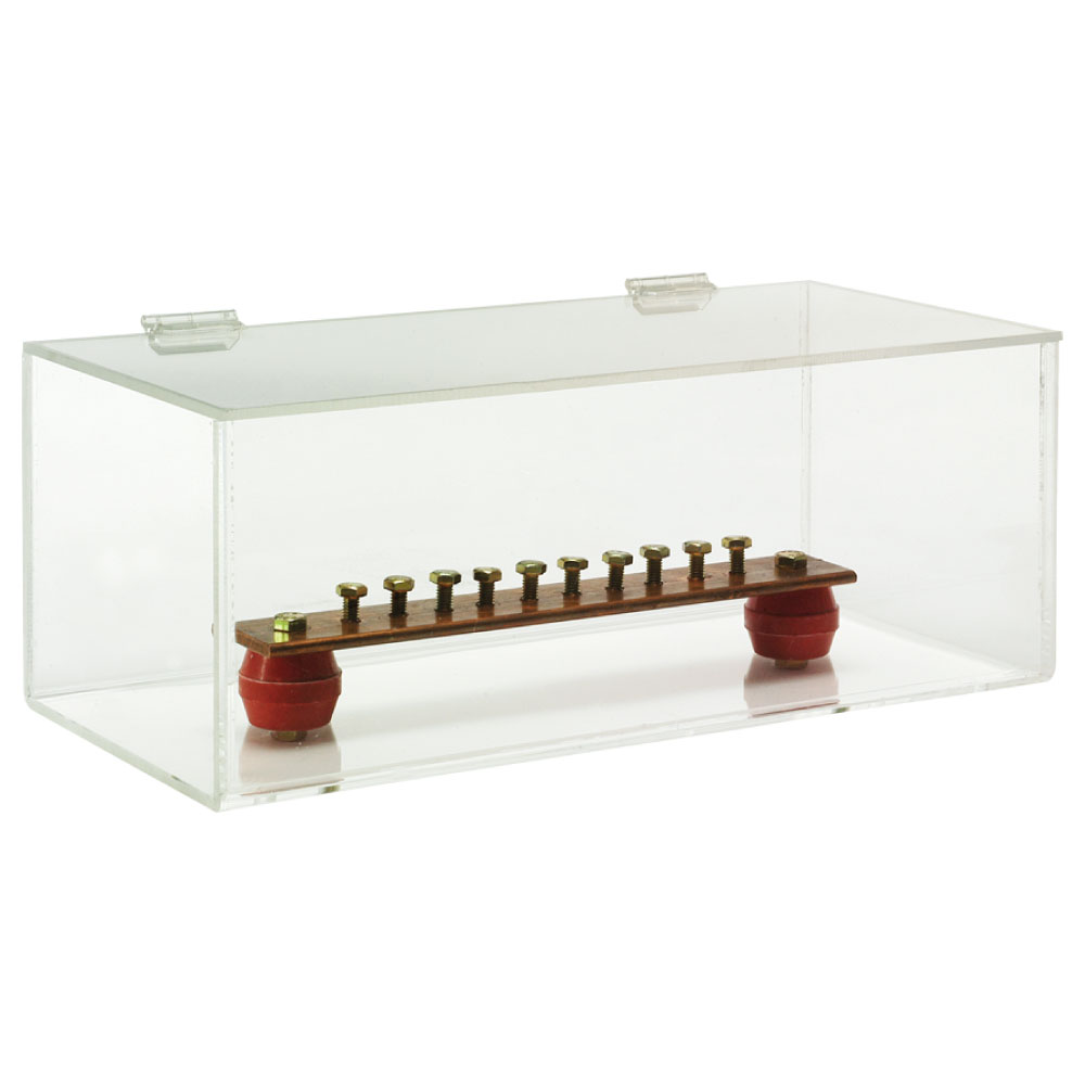 Bus de Conexión a Tierra 10 derivaciones formado por solera de Cobre espesor 1/4″, ancho 2″, largo 30cm en Caja de Acrílico. Incluye aisladores y tornillería en Acero Inoxidable MCA AMESA